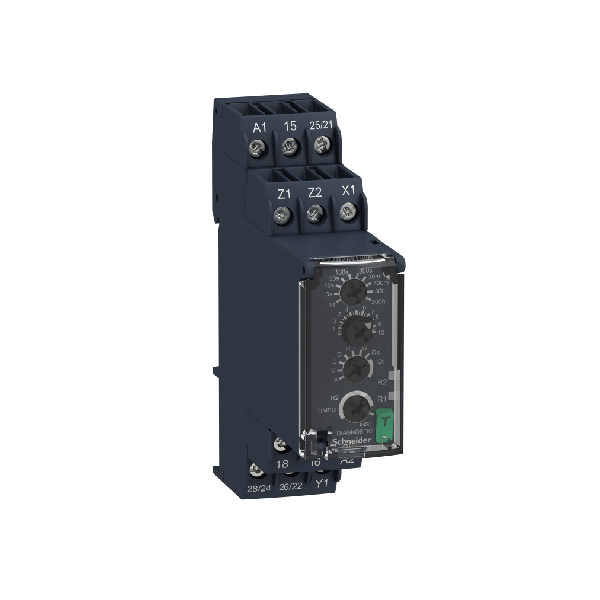 RELE TEMPORIZADOR MODULAR DE LA GAMA ZELIO TIME MODELO RE22R2MYMR, MULTIFUNCION CON 22 MODOS DE TEMPORIZACION (RETARDO A LA ACTIVACION, DESACTIVACION, INTERMITENCIA, INTERVALO Y ESTRELLA-TRIANGULO), RANGO DE TIEMPOS DE 0,05S A 300H. SALIDAS 2 CONTACTOS INVERSORES (2CO) DE 8A, ALIMENTACION UNIVERSAL 24…240V AC/DC, MONTAJE EN CARRIL DIN 35MM, PRECISION DE REPETICION ±0,5%. DURABILIDAD MECANICA DE 10 MILLONES DE CICLOS Y ELECTRICA DE 100.000 CICLOS, GRADO DE PROTECCION IP20 EN TERMINALES, IP40 EN CARCASA Y IP50 EN FRONTAL. INDICADORES LED PARA ESTADO Y TEMPORIZACION. IDEAL PARA APLICACIONES DE AUTOMATIZACION INDUSTRIAL Y CONTROL DE MOTORES.